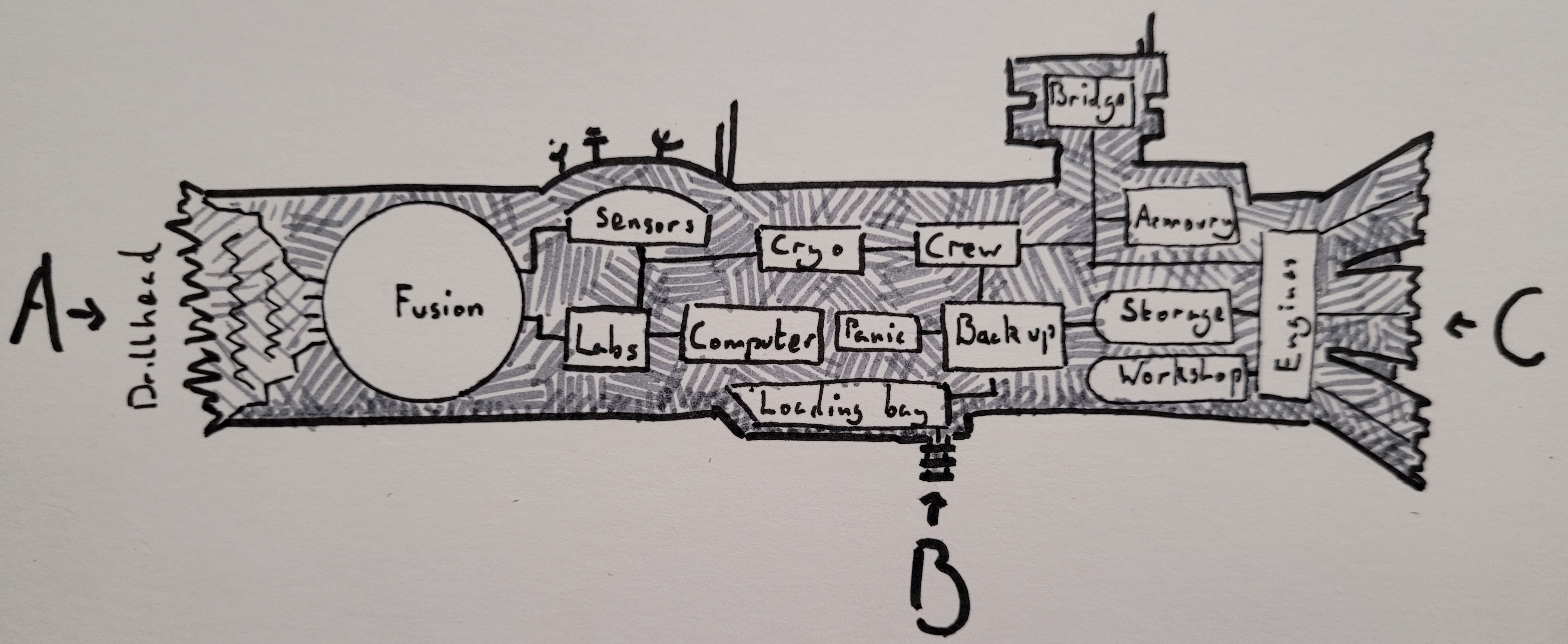 Carrion Protocol is a systemless micro dungeon designed to print on a single piece of paper. The players will explore a small spaceship that had its meat-growing labs start producing fast-growing monsters instead of food.